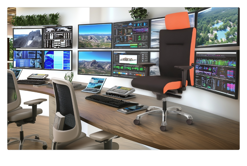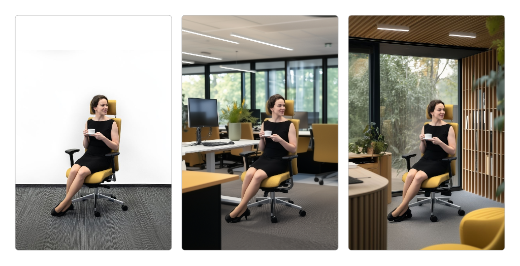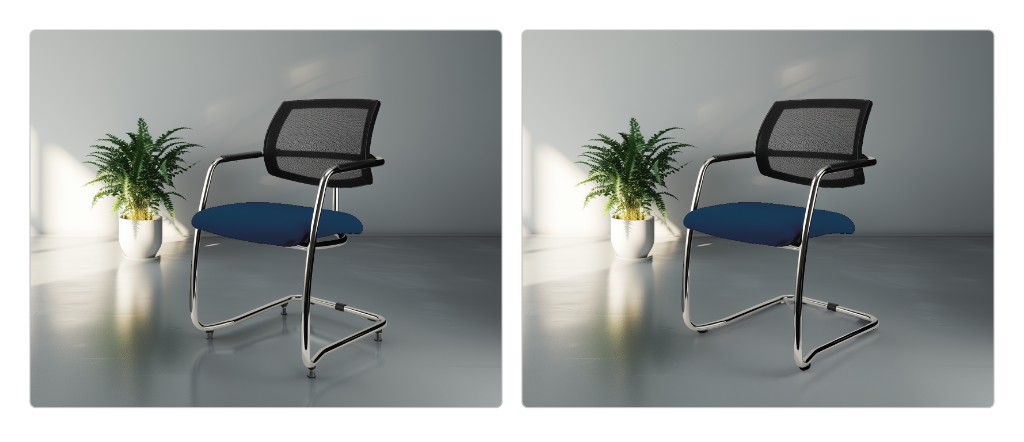 Díky referenční fotce, kterou používáme jako parametr –sref, má celé portfolio jednotný vizuální styl. Každý produkt tak umístíme do prostředí, které odpovídá jeho určení – manažerské židle do prestižních kanceláří a nábytek pro 24/7 použití do coworkingových prostor atp.