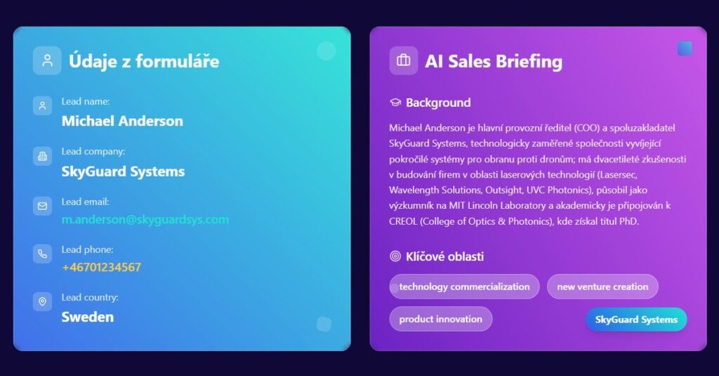 Představte si, že vám z webového formuláře přijde slibná poptávka. Pro obchodní tým našeho klienta to zpravidla znamená dohledávání informací o firmě a kontaktní osobě. Co kdyby tento krok zcela zmizel a obchodník dostal do e-mailu poptávku rovnou doplněnou o kompletní rešerši firmy a člověka, který ji zaslal? Přesně takové řešení jsme pod názvem AI Sales Briefing pro našeho klienta vytvořili.